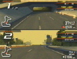 | ↑の裏技を応用した技。 まずVSモードのノーマルを選び、コースはサニービーチ(順走)、使用車はどちらもスペクトラにする(ブーストONだとより良し)。 2P側を中盤のトンネル前のジャンプを越えた辺りに逆走停車。 次に1Pを動かす。中盤のジャンプを越えて停車していた2Pのスペクトラを踏む。…すると… ジャンプしすぎて次のトンネルの天井を突き抜けてしまうのだ。 *2Pスペクトラを逆に停めた訳は、この辺りは少々坂になっているので普通に止めると少し移動してしまうから ちなみにこの技は、リッジBBSの記事No1886(アイスマンさん投稿)から応用させていただきました。