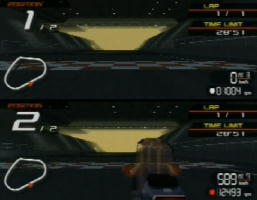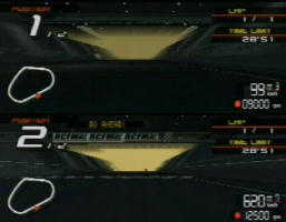 | スタート前のコースビューで、スタートボタンでショートカットするタイミングによって敵車のスタートの速さなどが変化します。 ショートカットせずにすべて見ると敵車のスタートがかなり遅くなり、逆に、ローディング後すぐにスタートボタンを押してショートカットすると敵車は速くなります。 なおこれは敵車のスタートのスピードを変えるだけで、2周目以降のスピードは変わりません。 | ![]() ![]() |